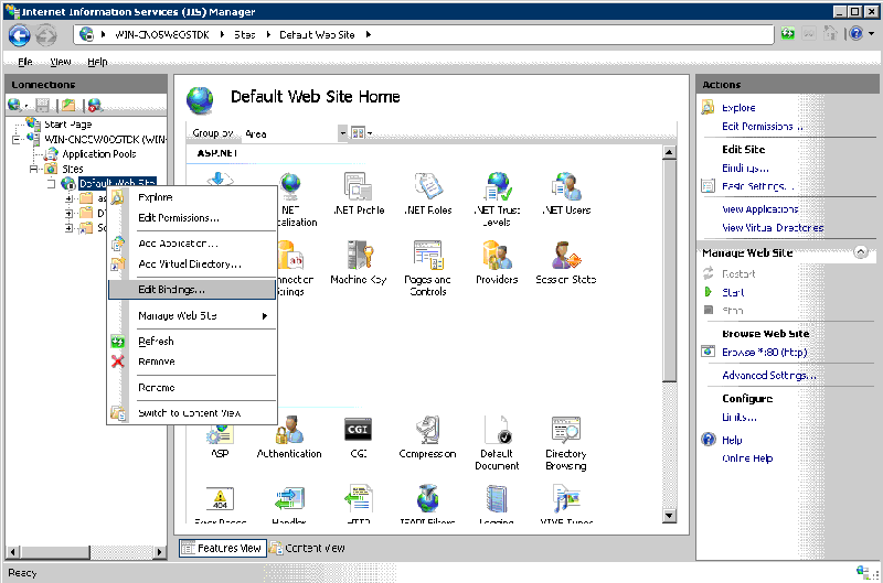 Select Default Web Site of Sites, right-click and select Edit Bindings.