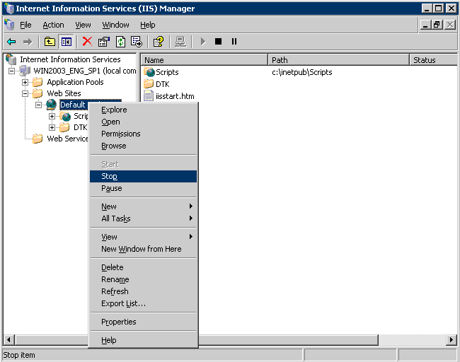 Select Default Web Sites of Web Sites, right-click and select Stop.