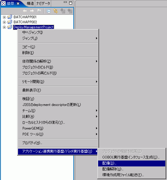[構造]ビュー、または[依存]ビューで配備管理用プロジェクトを選択してコンテキストメニューを表示し、[アプリケーション連携実行基盤/バッチ実行基盤] > [配備]を選択します。