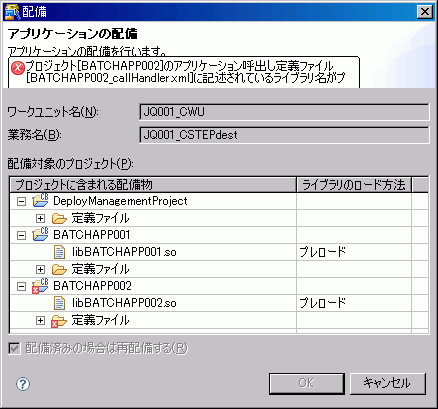 [配備済みの場合は再配備する]をチェックせずに、配備済みのワークユニットに対して配備を実行した場合、その旨のエラーメッセージが表示され、配備処理が中止されます。[配備済みの場合は再配備する]をチェックして、再度配備を実行してください。