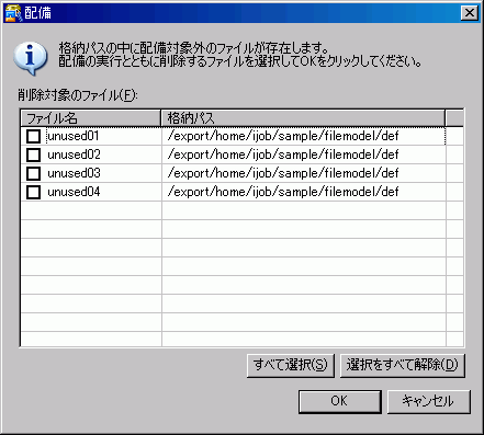 格納パスの中に存在する配備対象外のファイルが、[削除対象のファイル]一覧に表示されます。削除するファイルをチェックして[OK]をクリックすると、チェックされたファイルを削除した上で配備を実行します。[キャンセル]をクリックすると、配備処理を中止します。