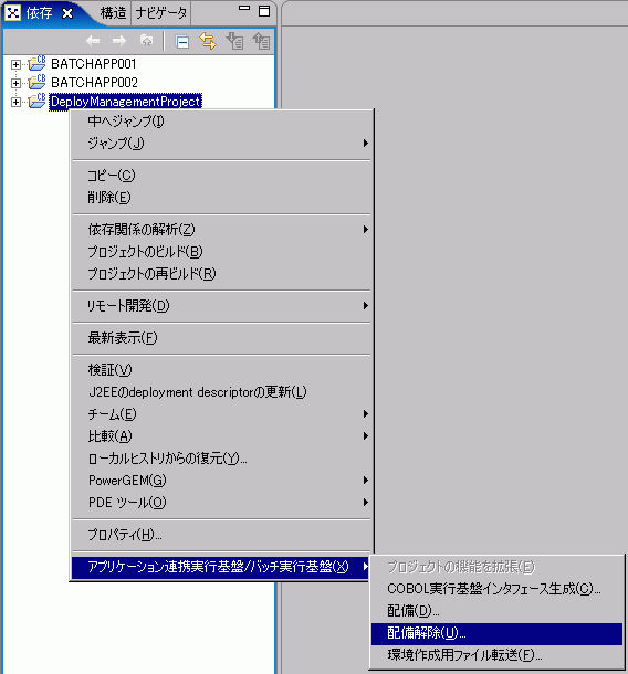 [構造]ビュー、または[依存]ビューで配備管理用プロジェクトを選択してコンテキストメニューを表示し、[アプリケーション連携実行基盤/バッチ実行基盤] > [配備解除]を選択します。