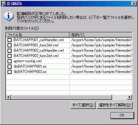 配備解除後、配備時に指定した定義ファイルの格納パス、プレロードライブラリの格納パス、およびダイナミックロードライブラリの格納パスに格納されているファイルに対して、削除するファイルを選択するダイアログボックスが表示されます。