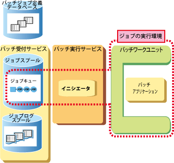 下図の点線箇所が“Interstage Job Workload Server”におけるジョブの実行環境です。