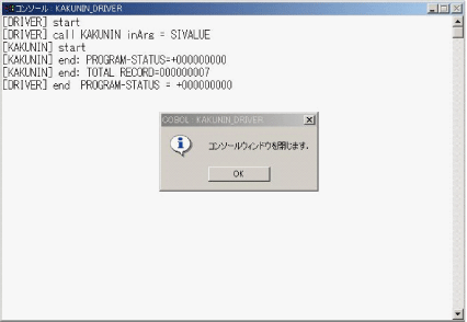 COBOLのバッチアプリケーションの実行結果確認を行います。“COBOLのバッチアプリケーションの実行(KAKUNIN)”でCOBOLのバッチアプリケーションを実行すると以下のような画面が出力されます。出力結果が同じであることを確認してください。