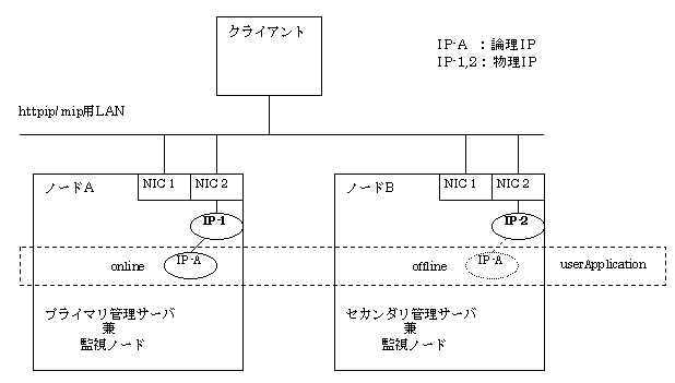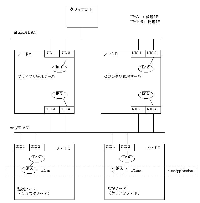 GLSによって二重化されたIPアドレスをクラスタシステムの業務(userApplication)の引継IPアドレスとして使用した場合には、業務の状態遷移によってWeb-Based Admin Viewからの監視および操作が継続できなくなります。そのため、mipやhttpipには、業務の状態遷移に関係なく使用できるIPアドレスを設定する必要があります。