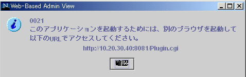 再び、最初に表示したWeb-Based Admin View画面を表示させる場合には、Webブラウザの新規ウィンドウを起動するか、もしくは新たに別のWebブラウザを起動し、最初のアクセス方法(http://ホスト名orIPアドレス:ポート番号)でアクセスしてください。