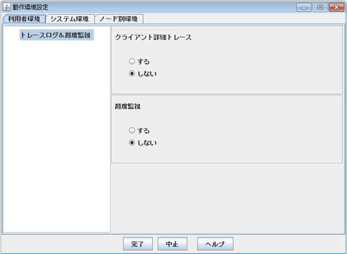クライアント詳細トレースログを収集する/しないの設定、離席監視時間の設定をします。