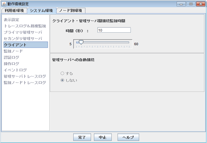 クライアント・管理サーバ間接続監視時間の設定と管理サーバへの自動接続設定の表示を行います。