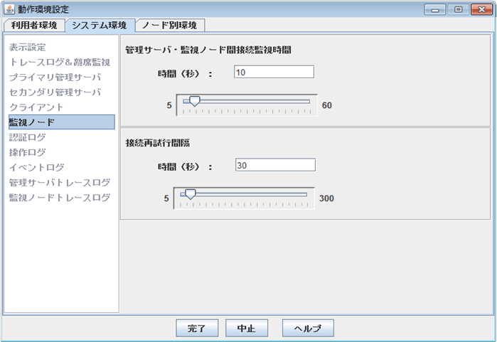 管理サーバ・監視ノード間接続監視時間、接続再試行間隔を設定します。
