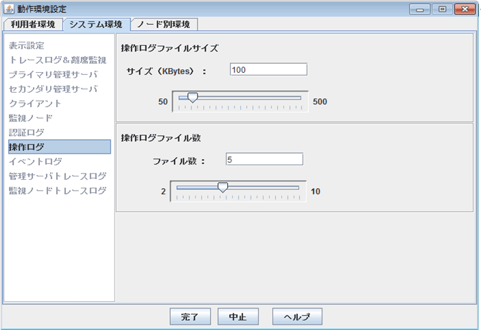 管理サーバの操作ログファイルのサイズと個数を設定します。