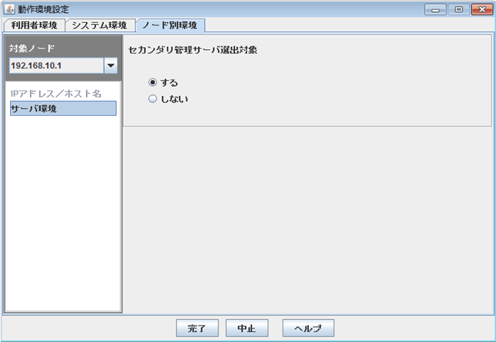 [対象ノード]で選択した監視ノードを、セカンダリ管理サーバとして自動的に選出するかどうかを指定します。初期値は"する"です。
