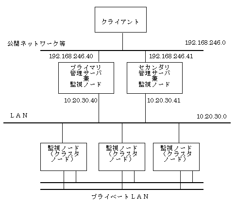 この設定を行った運用形態において、管理サーバのmipに設定した値と同じLAN(上記、図の10.20.30.0のLAN)上にクライアントを配置する場合には、httpipへの通信要求をmipに転送するようなルーティング情報を、管理サーバ側に設定する必要があります。
