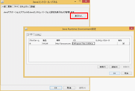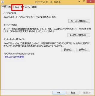 「コントールパネル」→「Java」より、Javaコントロールパネルを起動し、「Java」タブを選択してください。