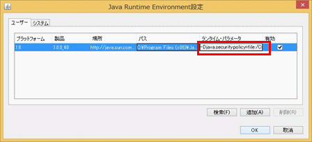 第1フィールドのプラットフォームが1.8の行のランタイム・パラメータに、以下の形式でjava.policyを使用するパラメタを追加してください。