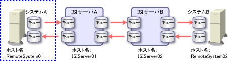 この例では、“B.4.1 セットアップ”で作成した環境で、システムAのマシンリプレイス後にISIServer01とRemoteSystem01間のキュー間転送の環境を再構築します。構成の詳細は、“B.4.1 セットアップ”を参照してください。
