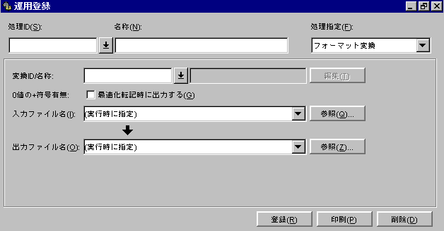 設定したフォーマット変換ID/名称“HEN 伝票から一般へ変換”を実行するために、入力ファイル、および出力ファイルを登録します。