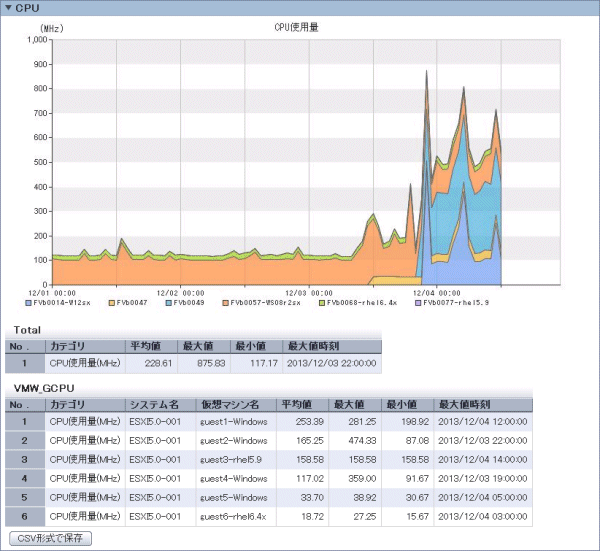 仮想ホスト内の仮想マシンのリソース使用情報が積み上げグラフで表示されます。