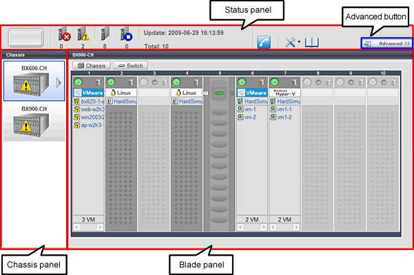 To switch from BladeViewer to the ROR console, click [Advanced>>], which is displayed in the upper-right of the BladeViewer screen.