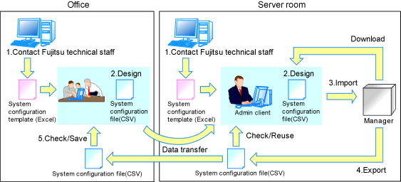 From a traditional work office (or another off-site location), define the various parameters required for Resource Orchestrator and record them in a system configuration file. Next, send this definition file to your actual system location (machine room), and import the file into Resource Orchestrator using the import functionality of the ROR console. This single operation automates the registration of all the servers defined in the system configuration file.