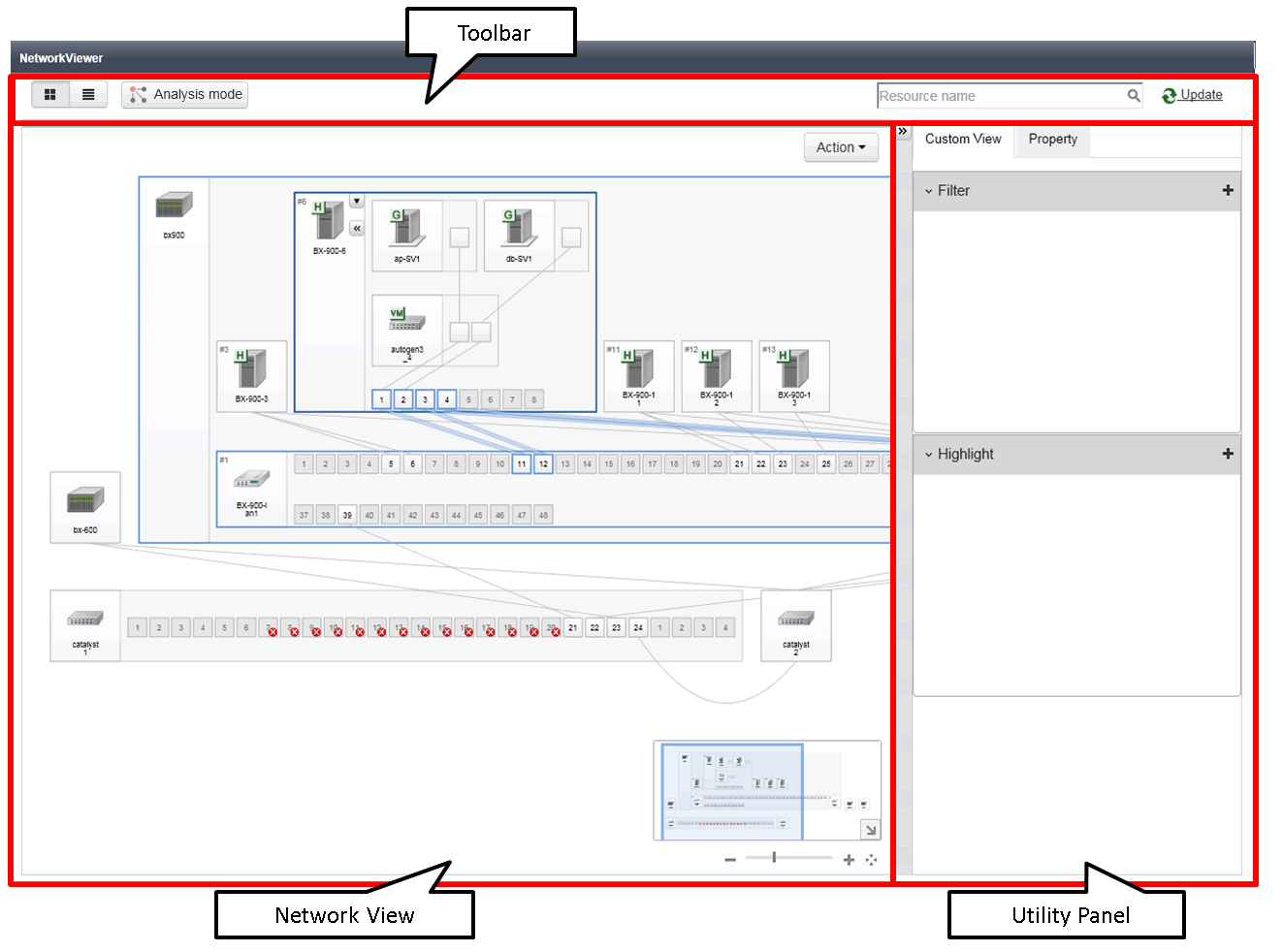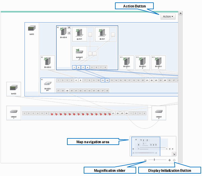 By dropping and dragging the display frame in the map navigation area, the display location of the network view can be scrolled in coordination with the frame.