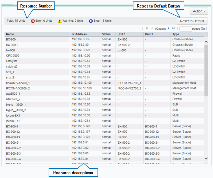 *1: For the resources that form a three-tier system (Unit1->Unit2->Resource), corresponding resource name is displayed in the "Name", "Unit1", and "Unit2" fields. For the resources that form a two-tier system (Unit1->Resource), corresponding name is displayed in the "Name" and "Unit1" fields and "-" is displayed in the "Unit2" field.
