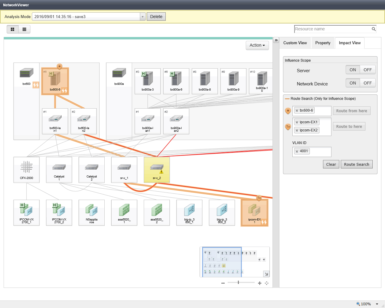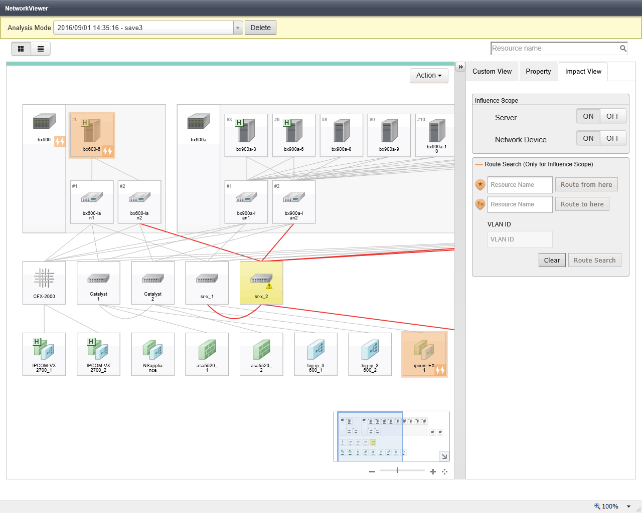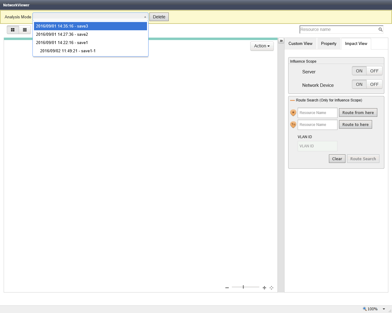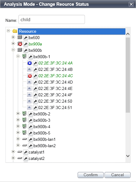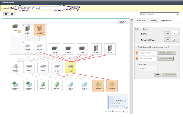 This function changes the statuses of resources displayed in the network view and saves the modified failure state data. This enables you to confirm the affected scope when trouble occurs on a particular resource, using the [Analysis Mode] window.