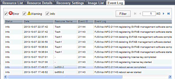 When a resource's status becomes "fatal", its related event shows an "Error" status in the [Status] column. For this reason, the actual status of a resource should be confirmed from either the resource tree or the [Resource List] tab.