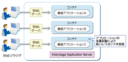 アプリケーションの多重実行を制御して、多数のリクエストに対しても安定したレスポンスを保証します。アクセス集中などによる性能劣化を防ぐとともに、CPU性能を有効に利用でき、スケーラブルな構成にも対応できます。