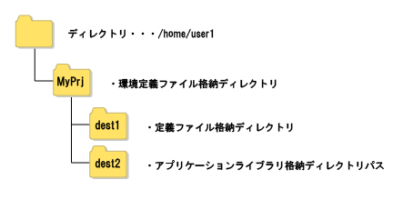 以下に[実行環境での定義ファイル一時格納先パス]として“/home/user1/MyPrj”、[定義ファイル格納ディレクトリパス]として“/home/user1/MyPrj/dest1”、[アプリケーションライブラリ格納ディレクトリパス]として、“/home/user1/MyPrj/dest2”を指定していた場合のディレクトリ構成の例を示します。