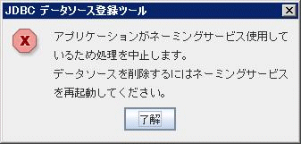 アプリケーションの運用開始後は、ネーミングサービスを再起動するまで、データソースを削除することはできません。アプリケーションの運用開始後にデータソースを削除しようとすると、以下のダイアログが表示されます。