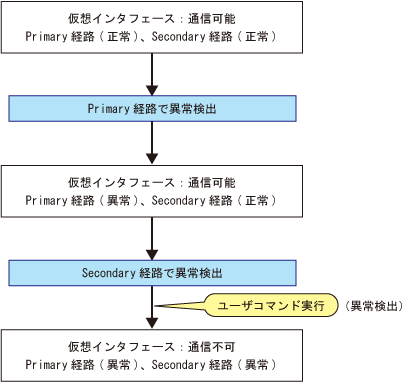 以下に、仮想インタフェースの異常、復旧検出時のユーザコマンド実行タイミングを示します。