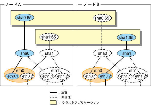 NIC切替方式におけるクラスタシステム上(相互待機)でのタグVLANインタフェース冗長化の構成図を示します。