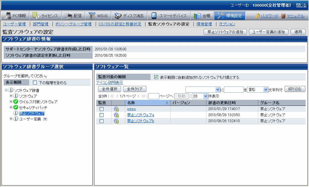 注3) 監査する禁止ソフトウェアを選択するためには、[環境設定]-[監査ソフトウェア]の[禁止ソフトウェア]に事前に定義しておく必要があります。