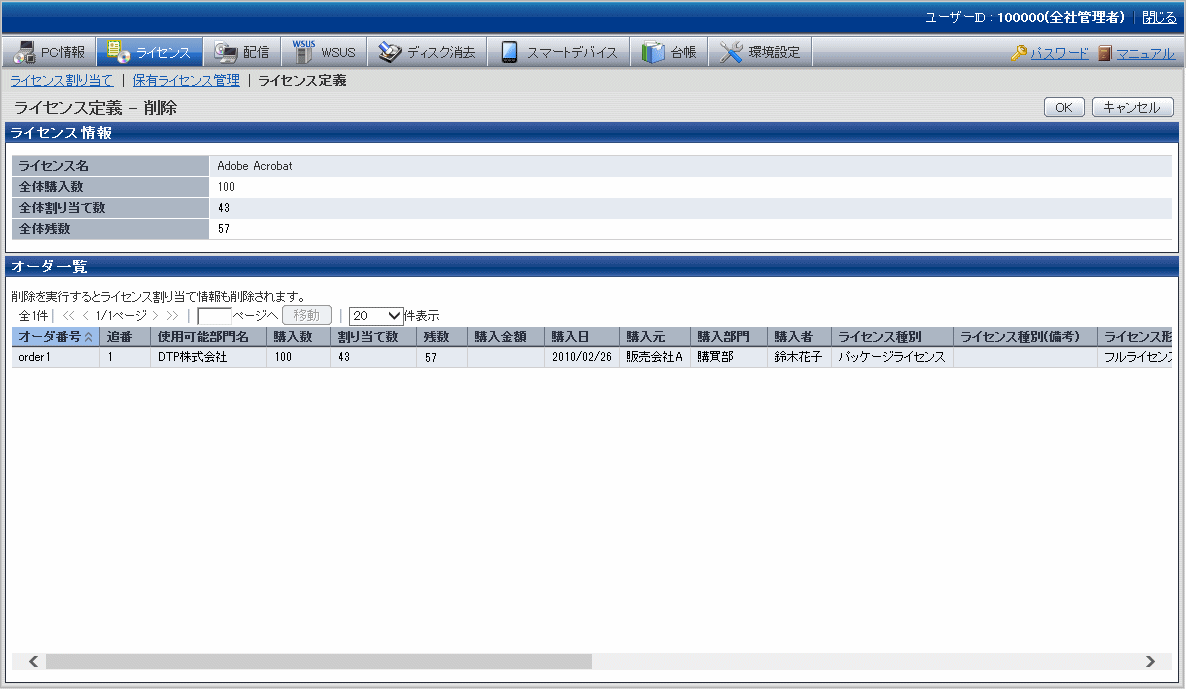 使用していたソフトウェアが必要なくなり、ライセンスを破棄する場合は、ライセンスの削除を行います。