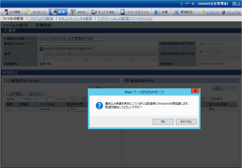 配信対象のPCに書き込み保護が「有効」のPCを含むタスクがあり、それを開始する場合は、以下のメッセージを表示します。確認の上、問題無ければ[OK]ボタンをクリックしてタスクを開始してください。
