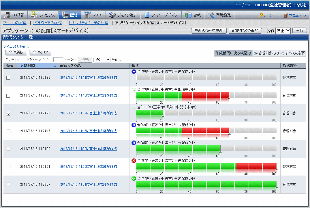 複数の配信タスクにチェックを行った際に停止できない配信タスクを含んでいた場合は、停止できる配信タスクのみ停止します。