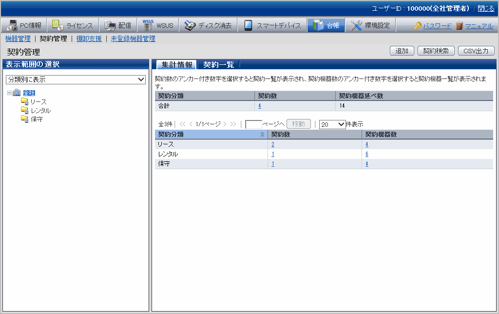 [契約機器延べ数] | リース/レンタル/保守契約の契約機器数の合計値です。 1台の機器にリース契約と保守契約が割り当てしている場合、2台として集計されます。 |