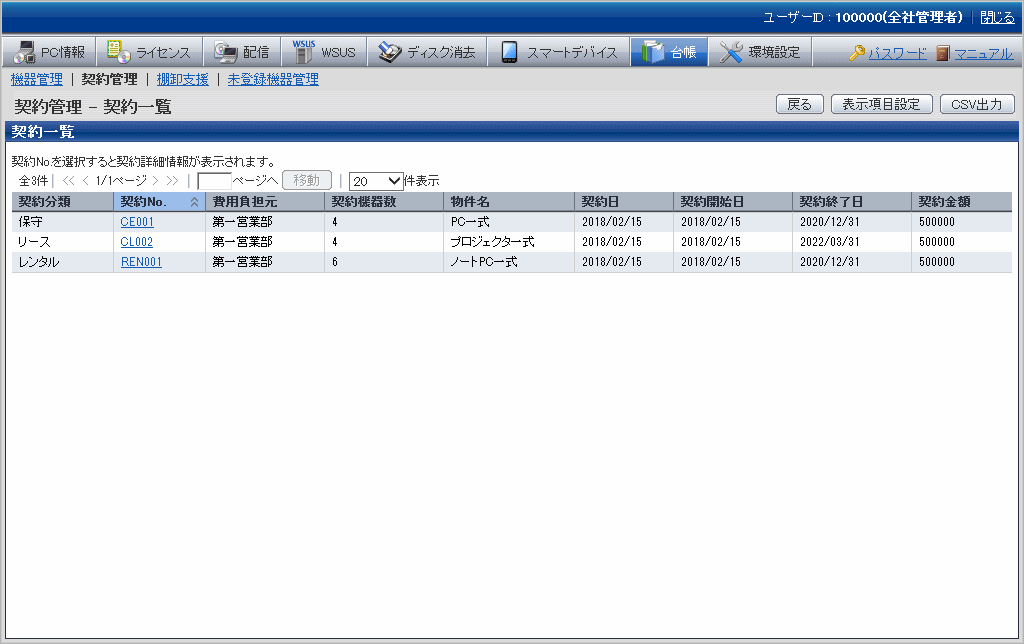[契約No.] | 契約の番号情報です。 機器情報として登録されている[契約No.]の情報です。 |