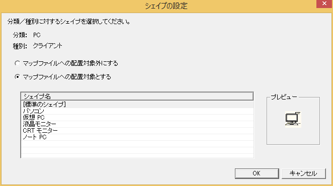 ロケーションマップ機能では、分類/種別に対するシェイプの関連付けがされていない場合、該当の分類/種別に対して[標準のシェイプ]で定義されたシェイプが関連付けられます。この[標準のシェイプ]に代表的なシェイプを設定しておけば、すべての分類/種別に対して、シェイプを関連付ける必要がなくなります(設定が省略された分類/種別はすべて同じシェイプに関連付けられます)。