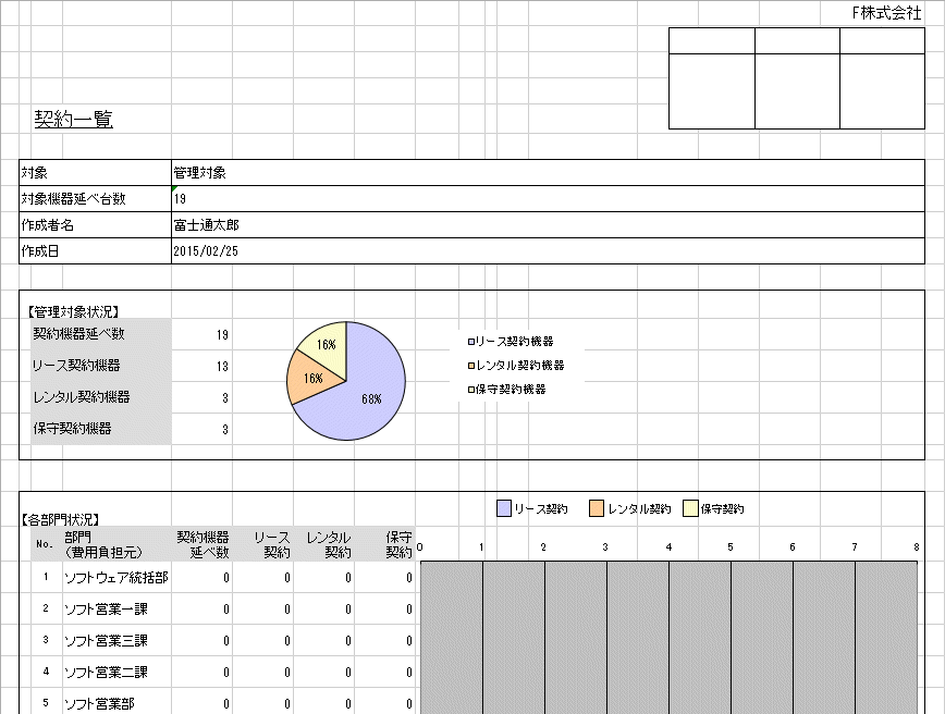 レポートは「概要部」と「詳細部」から構成されています。さらに、「概要部」では各部門状況、「詳細部」ではリース/レンタル/保守契約情報を出力できます。