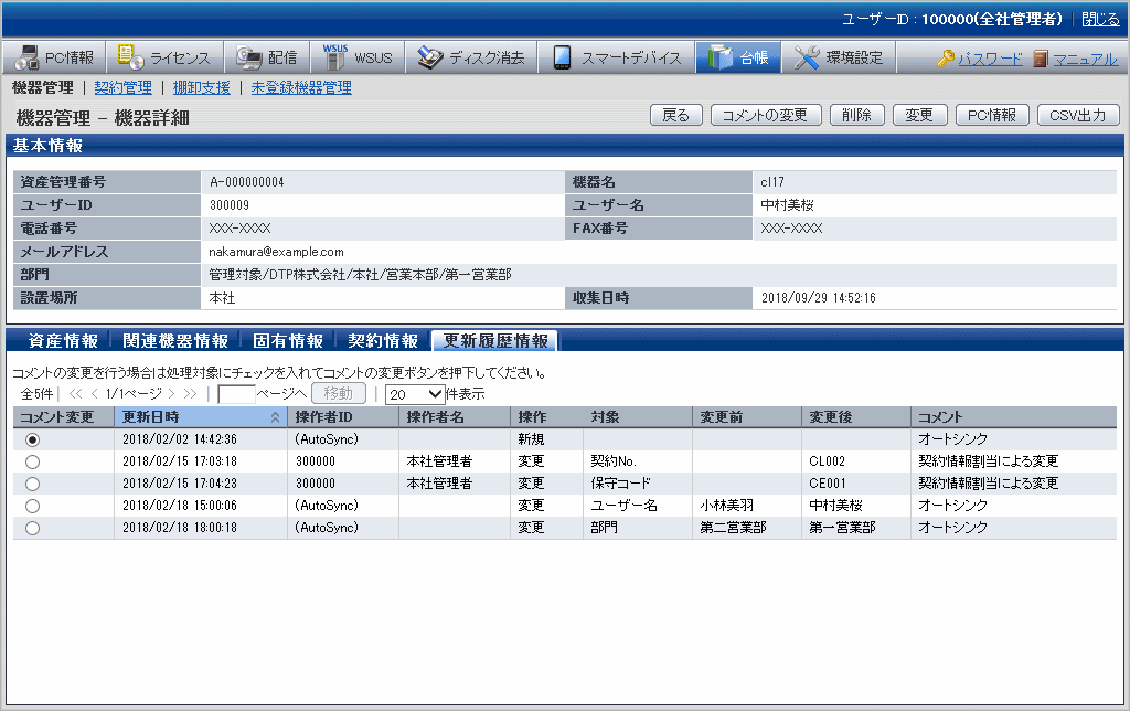[コメント] | 機器情報変更履歴に対するコメントです。[コメント]には、機器情報の登録/変更/削除時に、自動で設定されるコメント、またはユーザーが設定したコメントが表示されます。 以下の操作時に、自動でコメントが設定されます。