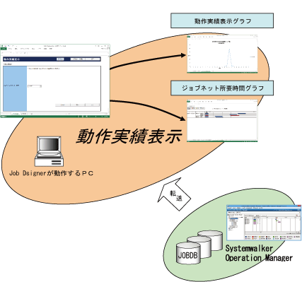 バッチジョブのスケジューラであるSystemwalker Operation Managerでは、動作したジョブ/ジョブネットの稼動情報を稼動実績情報ファイル(以下JOBDB)(注1)として取得しています。このJOBDBを解析し、いつどのジョブ/ジョブネットがどれだけ動作したのかをグラフ表示し、ジョブ/ジョブネットの動作を把握することが可能となります。