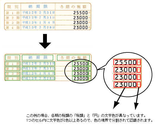 下記の例のように1つのセルの中に文字色が2色以上ある帳票を認識した場合、色の境界で分割されて認識されます。