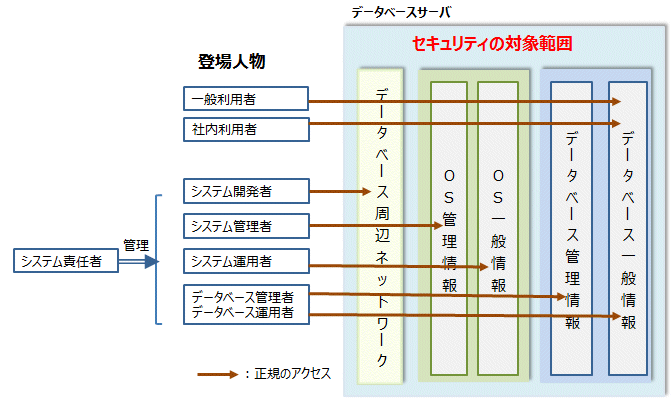 データベースシステムでは、データベースサーバおよびデータベース周辺ネットワークをセキュリティの対象範囲とします。登場人物とそれぞれの登場人物がどの範囲で関わるかを明確にして、登場人物ごとにセキュリティ対策を考える必要があります。