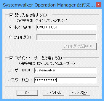 表示された[Systemwalker Operation Manager 配付先 [ログイン]]ウィンドウで配付先を指定します。配付先は、ホスト名を指定する方法とフォルダを指定する方法があります。ホスト名を指定する場合は、ホスト名、ユーザーIDおよびパスワードを指定します。フォルダを指定する場合は、[フォルダの選択]ボタンをクリックして表示される[配付先フォルダの選択]ウィンドウで、配付先フォルダを指定します。