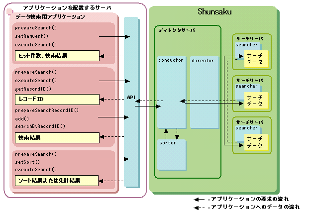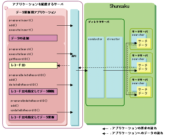 XML文書中でデータを特定できるキー(ダイレクトアクセスキー)を使用して、データの検索および更新を行うことができます。アプリケーションからのキー情報により、Shunsakuではサーチサーバの全データを検索することなく、ダイレクトにdirectorからデータを返却することができます。通常のデータ検索および更新処理と比べ、対象XML文書のレコードIDを取得する必要がないので、より迅速なデータ検索およびデータ更新を行うことができます。
