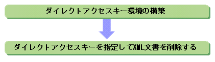 あらかじめ削除対象のXML文書の内容がわかっている場合は、ダイレクトアクセスキーを使用したデータ削除処理(以降、ダイレクト削除と呼びます)を実行します。ダイレクト削除は、通常のレコードIDによる“4.3 データを削除する”とは異なり、削除対象のXML文書のレコードIDを取得する必要はありません。