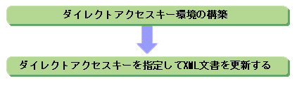あらかじめ更新対象のXML文書の内容がわかっている場合は、ダイレクトアクセスキーを使用したデータ更新処理(以降、ダイレクト更新と呼びます)を実行します。ダイレクト更新は、通常のレコードIDによる“4.4 データを更新する”とは異なり、更新対象のXML文書のレコードIDを取得する必要はありません。このため、直接、更新するXML文書をAPIに指定することで、更新処理を、簡単、かつ、高速に実現することができます。