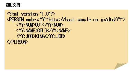 <?xml version="1.0"?> <MappingRule> <parentRule id="p1" tagname="PERSON" /> <extensionRule id="e1" attrname="xmlns:YY" attrof="p1" extender="STATIC" extender-arg="http://host.sample.co.jp/dtd/YY"/> <columnRule id="c1" colname="A" tagname="YY:NUM" parent="p1" /> <columnRule id="c2" colname="B" tagname="YY:NAME" parent="p1" /> <columnRule id="c3" colname="C" tagname="YY:JOB" parent="p1" /> </MappingRule> |